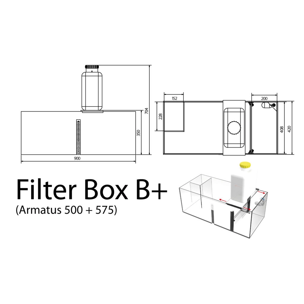 Najważniejszym elementem zestawu jest wysokiej klasy sump pełniący rolę zbiornika filtracyjnego. To prawdziwe serce akwarium. Niewidoczne, ale nieprzerwanie pracujące na rzecz domowej rafy koralowej. Sump został odpowiednio dobrany do znajdującego się w zestawie akwarium. Zbiornik posiada komory spływu, wyposażone w skarpety filtrujące. Przegrody pomiędzy komorami redukują hałas przepływającej wody, a komora odpieniacza posiada regulację poziomu wody.