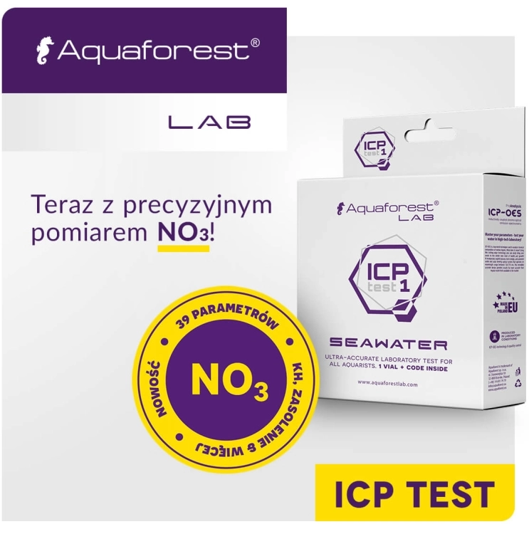 Aquaforest ICP Test 1 jest usługą umożliwiającą dokładne zbadanie parametrów i składu wody w Twoim zbiorniku. Próbki pobrane akwarium trafią do analizy dokonywanej spektrometrem ICP-OES, która precyzyjnie wskaże poziom mikroelementów, pierwiastków, a także substancji szkodliwych i toksyn. Dzięki analizie dowiesz się, które makro- i mikroelementy powinny zostać uzupełnione lub są obecne w nadmiarze. Analiza ułatwi Ci stworzenie środowiska wodnego zbliżonego do naturalnej wody morskiej.