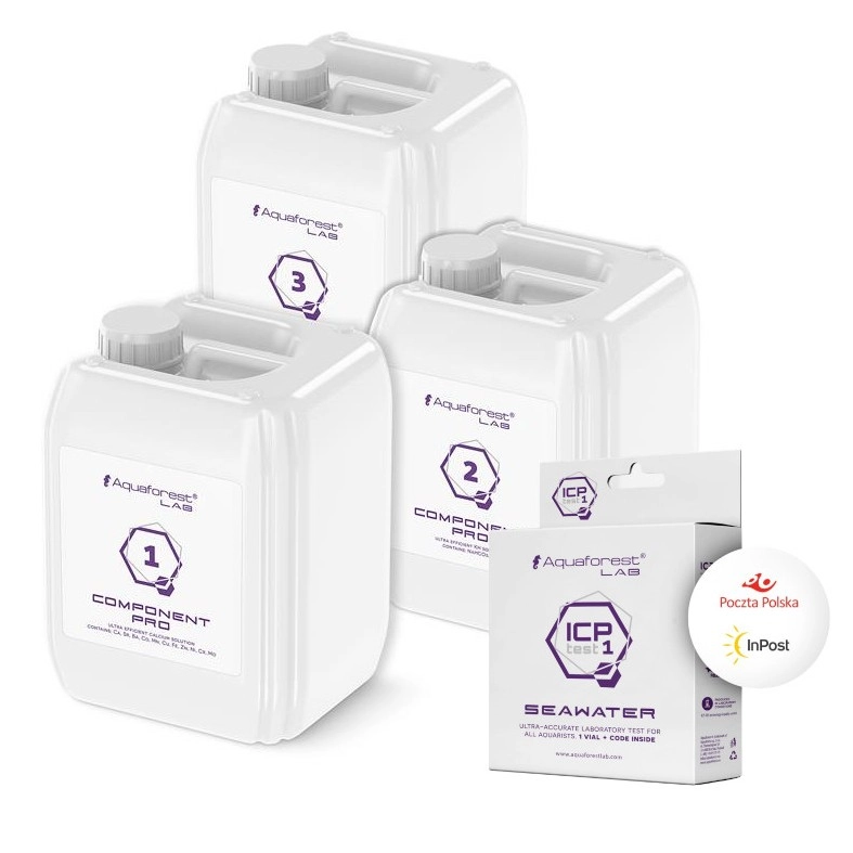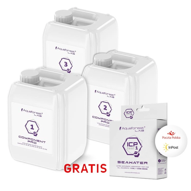 Aquaforest Component 1+ 2+ 3+ Pro to gotowy zestaw do metody Ballinga. Składa się z 3 płynów zawierających odpowiednio Ca, KH, Mg. Silnie skoncentrowana formuła wzbogacona o mikroelementy niezbędne do prawidłowego funkcjonowania akwarium rafowego. Super promocja płacisz tylko za komponenty i dodatkowo dostajesz gratis Test ICP.