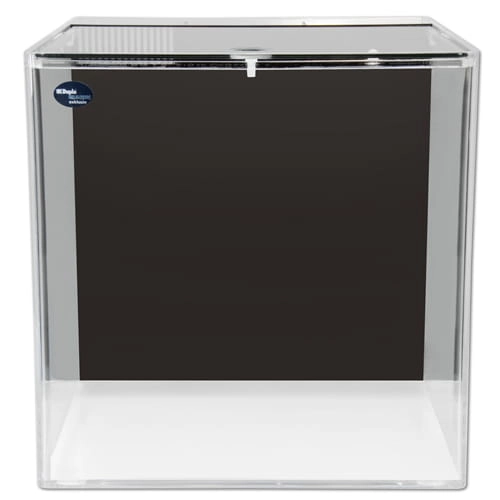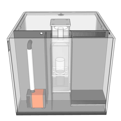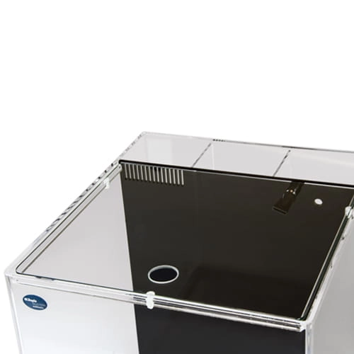 Szklany zbiornik o kształcie kostki ma wymiary 45x45x40 cm i pojemność 80 l, z czego 18 l przypada na panel filtracyjny. Całe akwarium zostało wykonane z utraprzezroczystego, giętego szkła, które doskonale odwzorowuje kolorystykę rafy. Z przodu jest pozbawione narożników co daje niesamowity efekt bezpośredniego kontaktu z naturą. Tło stanowi czarna szklana tafla ukrywająca filtr. Akwarium posiada wbudowany panel filtracyjny, który zastępuje sumpa. Takie rozwiązanie znacznie ułatwia obsługę zbiornika i sprawia, że wyposażenie techniczne staje się niewidoczne. Filtr o dużej pojemności został podzielony na komory, w których zmieścisz sporo wkładów filtracyjnych i pompę, a także odpieniacz jeśli go posiadasz. Ale zbiornik będzie doskonale funkcjonował także bez tego ostatniego. Wlot do systemu filtracji stanowi grzebień, który pełni rolę prefiltra, przechwytuje największe zanieczyszczenia. Następnie woda wpada na gąbkę, dalej przepływa po kolei przez komory, a po oczyszczeniu trafia z powrotem do zbiornika głównego. W panelu zmieścisz sporo wkładów biologicznych (brak w zestawie) i wszystkie niezbędne sprzęty np. grzałkę o ile będzie potrzebna.
