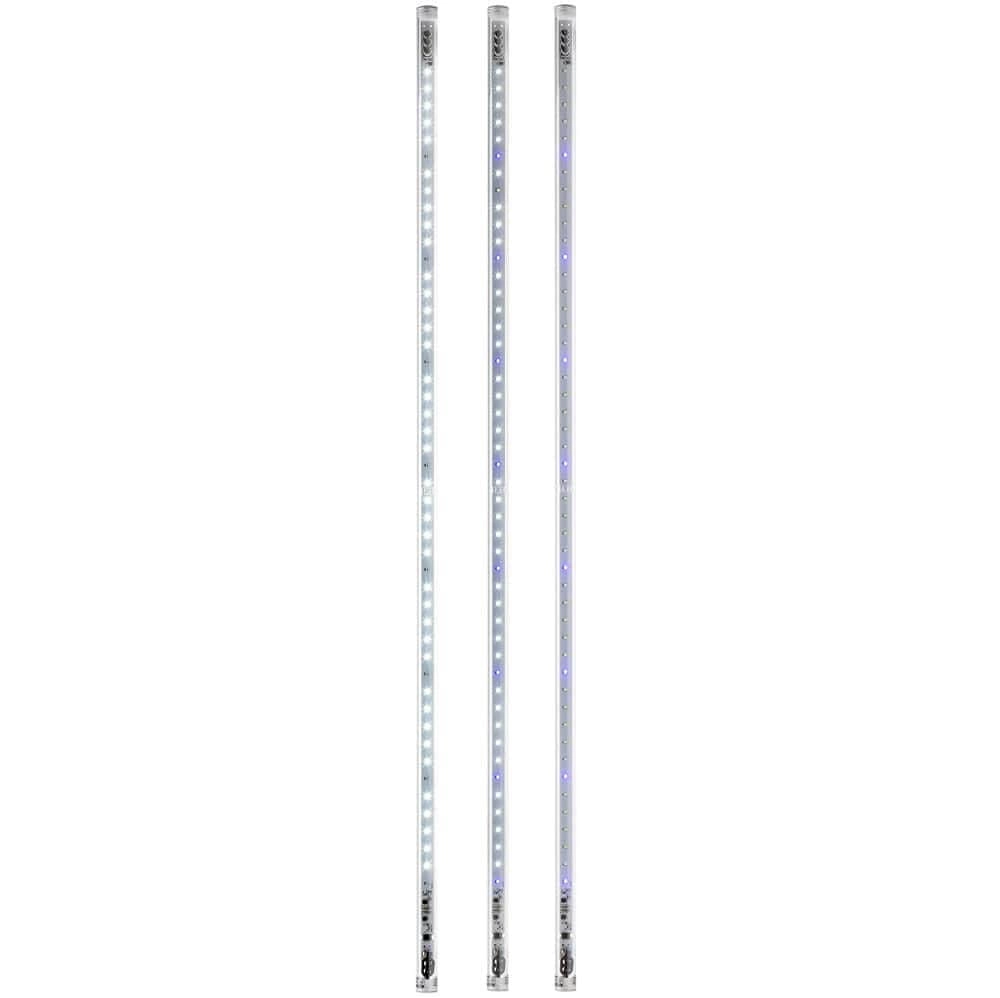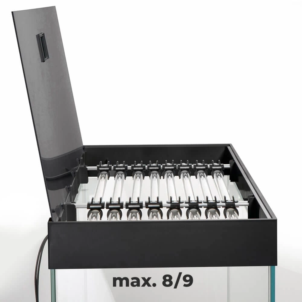 Akwaria Aquael Glossy to nie tylko wyjątkowe zbiorniki, ale również idealnie dopasowane pokrywy. Polski producent zdecydował się scalić akwarium i pokrywę w jednolitą bryłę. Pod pokrywą znajdziemy oświetlenie rozmieszczone na dwóch szynach. Te pozwalają na dowolne ustawienie źródeł światła w celu osiągnięcia pożądanego efektu. Za oświetlenie zbiornika posłużą nam dwie tuby ledowe Aquael Leddy Tube Day & Night, każda o mocy 14 W. Zastosowanie wysokiej klasy diod LED skutkuje niskim zużyciem prądu oraz długowiecznością urządzenia. Szyny umożliwiają rozbudowę oświetlenia o kolejne Aquael Leddy Tube. Taki zestaw sprosta wymaganiom nawet najbardziej wymagających roślin.