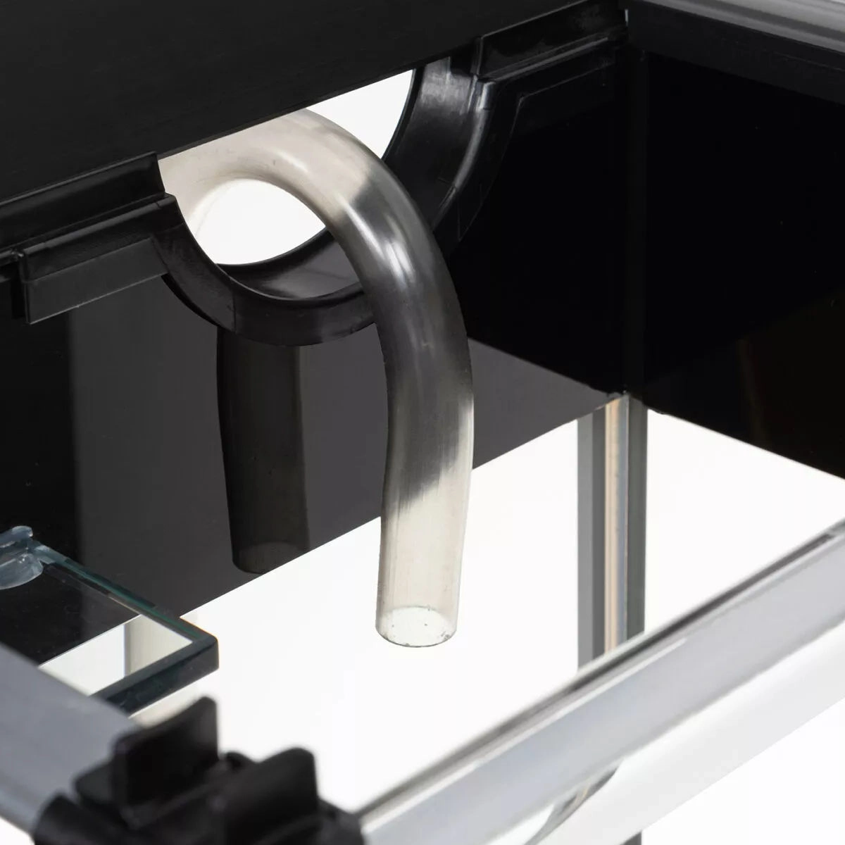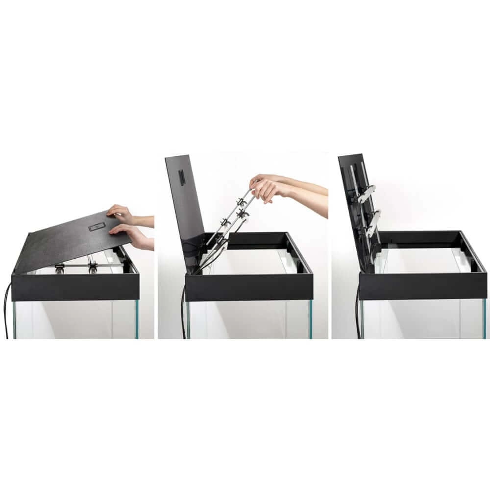 Aquael Glossy to linia produktów stworzonych dla najbardziej wymagających akwarystów. Poza niesamowitym wyglądem oferują kilka ułatwień, które docenimy podczas obsługi akwarium. W górnej części tylnej ściany zostały przygotowane owalne otwory. Służą one łatwemu zamontowaniu filtra zewnętrznego oraz wszelkiego okablowania. Nie jesteśmy już zmuszeni do wycinania prześwitów w pokrywie, psujących jej estetykę. Dodatkowo umieszczenie otworów w tym miejscu sprawia, że węże od filtra oraz wszelkie przewody stają się praktycznie niezauważalne. Pokrywa wyposażona została w klapkę do codziennego karmienia ryb. Możesz także otworzyć całą pokrywę, co znacznie ułatwia prace serwisowe.