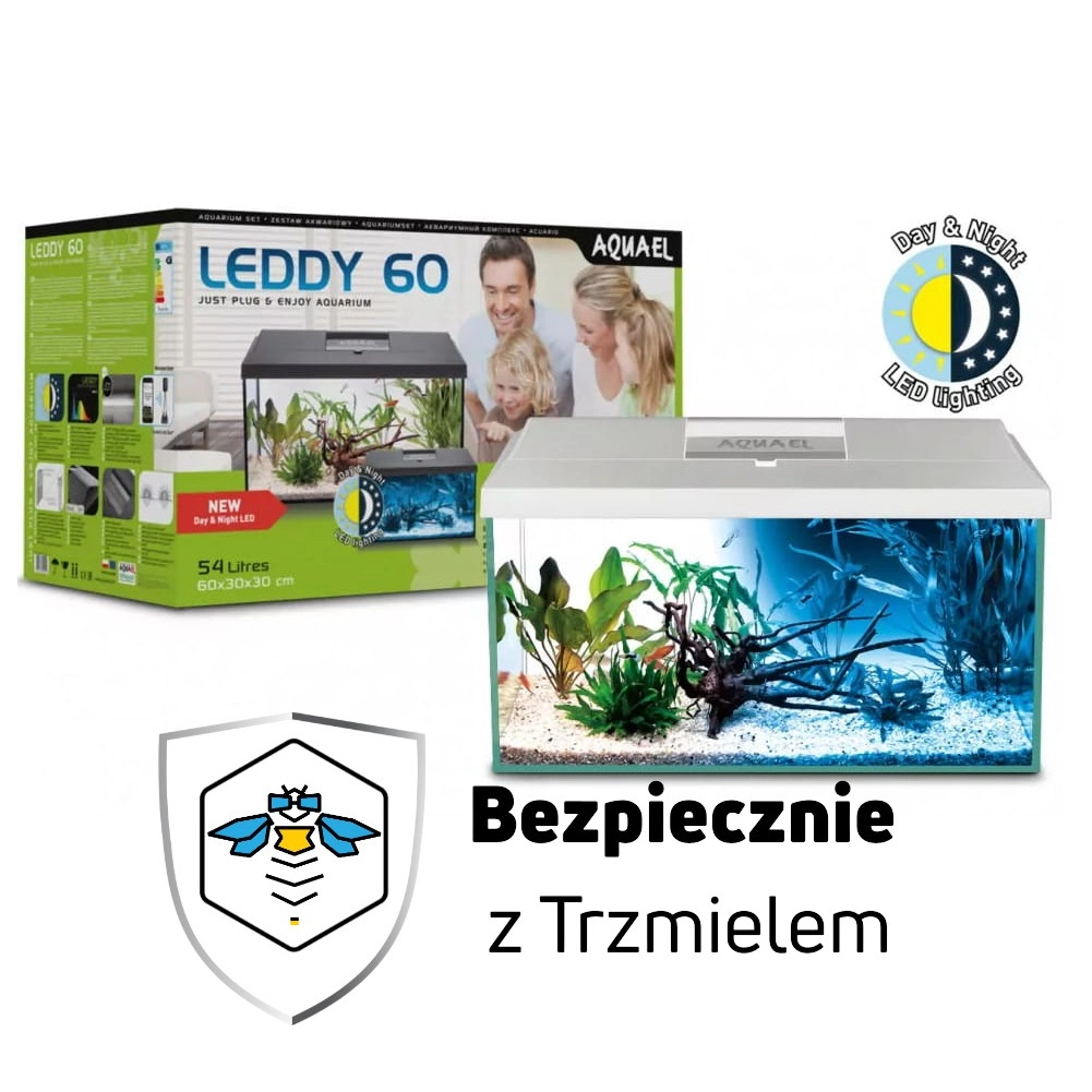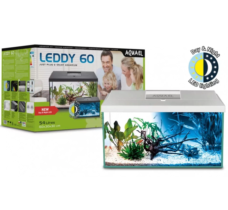 Aquael Leddy Day&Night 60 2.0 to nowoczesny zestaw akwariowy polskiej firmy Aquael, w kolorze białym. W komplecie: akwarium o pojemności 54 l, pokrywa, oświetlenie Aquael Leddy Tube Day & Night 2.0, wydajny filtr, grzałka z termostatem. Gotowy do instalacji. Umożliwia rozpoczęcie przygody z akwarystyką.
