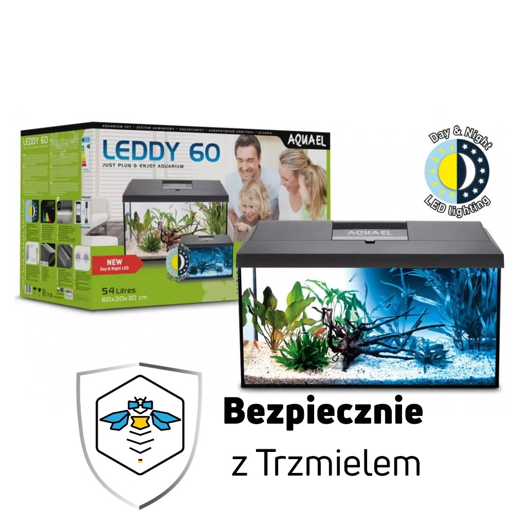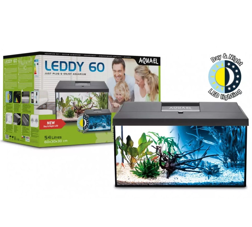 Aquael Leddy Day&Night 60 2.0 to nowoczesny zestaw akwariowy polskiej firmy Aquael, w kolorze czarnym. W komplecie: akwarium o pojemności 54 l, pokrywa, oświetlenie LED dzienne i nocne, wydajny filtr, grzałka z termostatem. Gotowy do instalacji. Umożliwia rozpoczęcie przygody z akwarystyką.
