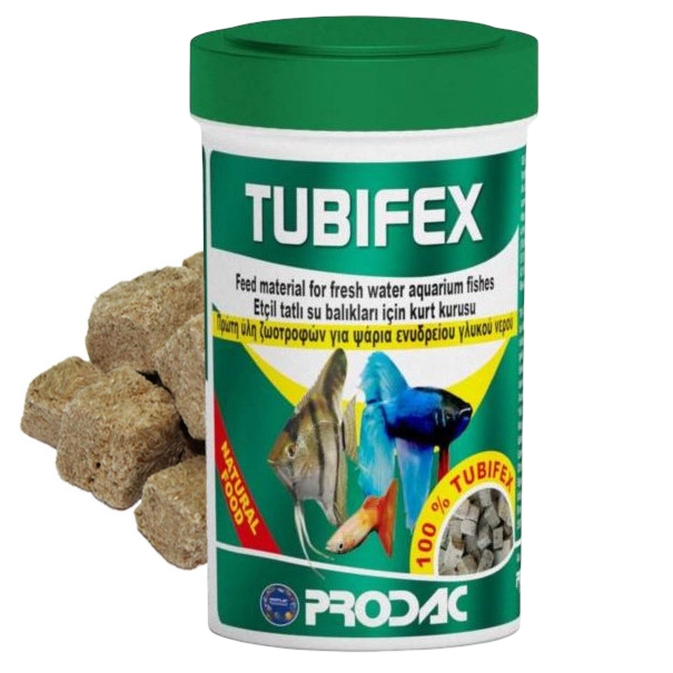Prodac Tubifex to naturalny pokarm dla ryb, żółwi i innych zwierząt wodnych. Stanowi świetne uzupełnienie diety wszystkich mięsożernych i wszystkożernych mieszkańców akwarium. Pokarm powstał w procesie liofilizacji, dzięki temu został zachowany smak i aromat rurecznika. Liofilizacja pozwala na długotrwałe przechowywanie bez ryzyka zepsucia. Karma ma formę wygodnych w użyciu kostek, które po nasiąknięciu wodą opadają na dno.