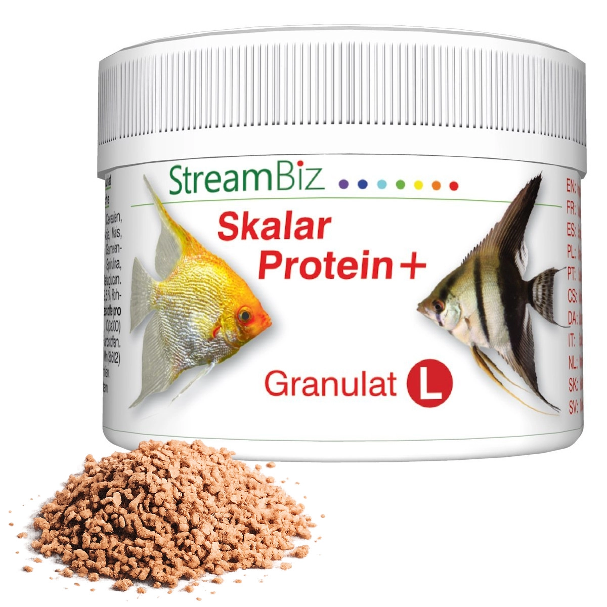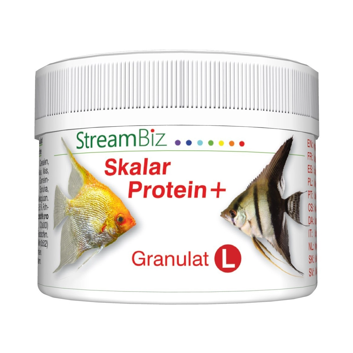 StremBiz Skalar Protein + Granulat L to pokarm w formie granulatu. Stworzony dla pielęgnic. Powstał wyłącznie z naturalnych składników takich jak: ryby i produkty pochodzenia rybnego, drobne skorupiaki i mięczaki. Skład ten wzbogacony składnikami roślinnymi doskonale odzwierciedla naturalną dietę ryb zamieszkujących Amazonkę. Jest chętnie pobierany przez wybredne dyskowce i skalary. Zawiera wszystkie niezbędne składniki pokarmowe, witaminy i minerały konieczne dla zachowania zdrowia i witalności ryb. Może stanowić podstawę diety nie tylko skalarów ale także innych mięsożernych i wszystkożernych pielęgnic. Skalar Protein + gwarantuje odpowiedni wzrost i rozwój, umożliwia prawidłowy wzrost i piękne wybarwienie młodych. Wspomaga również czystość wody w zbiorniku. Dzięki wysokiej strawności zmniejsza zanieczyszczenie akwarium. Co więcej granulat odznacza się wysoką hydrostabilnością i nie brudzi wody.
