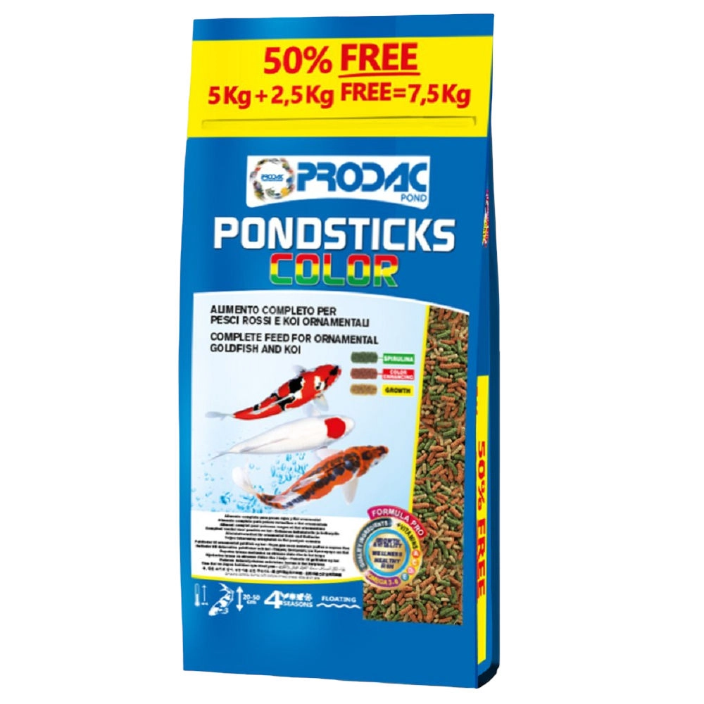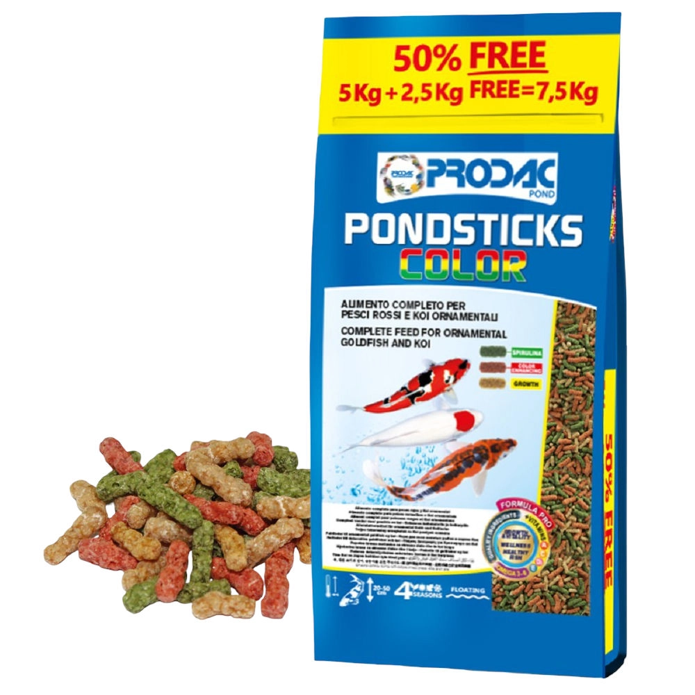 Prodac Pondsticks Color to pokarm wybarwiający zaspokajający potrzeby żywieniowe ryb stawowych. Polecany dla wszystkich barwnych odmian karpi koi, złotych rybek i innych ozdobnych ryb karpiowatych hodowanych w oczkach wodnych. Pokarm ten ma wygodną formę pływających na powierzchni wody pałeczek i jest łatwo dostępny dla ryb karpiowatych.