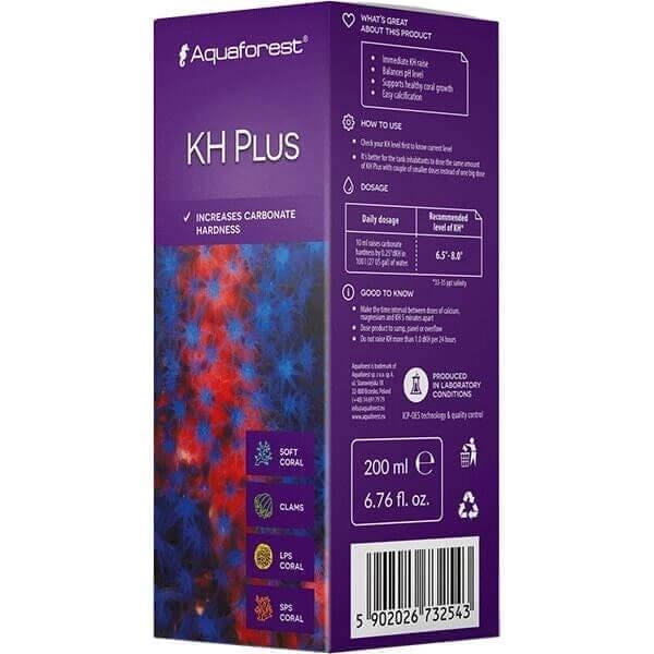 Skoncentrowany preparat, w płynie, do podnoszenia twardości węglanowej w akwarium morskim, poprzez dostarczanie rozpuszczonego jonu wodorowęglanowego. Twardość węglanowa (KH) stabilizuje kwasowość pH. Preparat jest niezbędny do prawidłowego wzrostu koralowców i zdrowego funkcjonowania skorupiaków. KH Plus jest pierwszym suplementem, który należy zastosować rozpoczynając hodowlę koralowców w akwarium morskim. Wystarczy odmierzyć odpowiednia dawkę i wlać do akwarium w miejscu silnego przepływu wody. 10 ml preparatu podnosi twardość węglanową, w 100 litrach wody, o 0,25 stopnia. Dozowanie należy dostosować do zapotrzebowania koralowców mierzonego testem Aquaforest Pro Alkalinity.