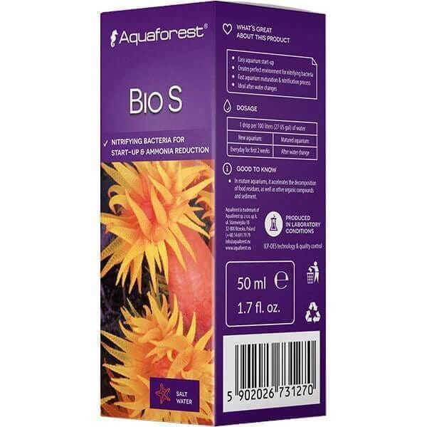 Specjalnie dobrany zestaw różnych gatunków bakterii, które zasiedlają żywą skałę, czyniąc z niej ogromny filtr biologiczny. Bakterie przeprowadzają tzw. cykl azotowy, czyli pobierają energię dzięki biologicznemu przetwarzaniu bardzo toksycznego amoniaku, na mniej toksyczne tlenki azotu. Dzięki dozowaniu tych bakterii znacznie skraca się czas, potrzebny do ustabilizowania się równowagi mikrobiologicznej w akwarium. Bio S przydatny jest także w dojrzałych akwariach, w których przyspiesza rozkład resztek pokarmu i innych związków organicznych, a nawet osadów. Sprzyja oczyszczaniu podłoża i poprawia klarowność wody. Możesz go używać również w zbiornikach z systemem filtracyjnym opartym na bakteriach probiotycznych. Jest niezwykle wydajny wystarczy podawać 1 kroplę na 100 litrów wody w akwarium, przez pierwsze 2 tygodnie od założenia zbiornika, a następnie stosować przy każdej podmianie wody, czyli raz w tygodniu.