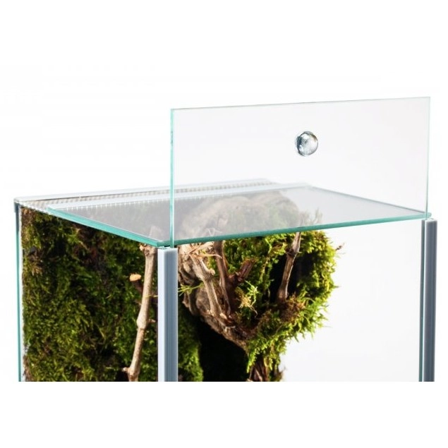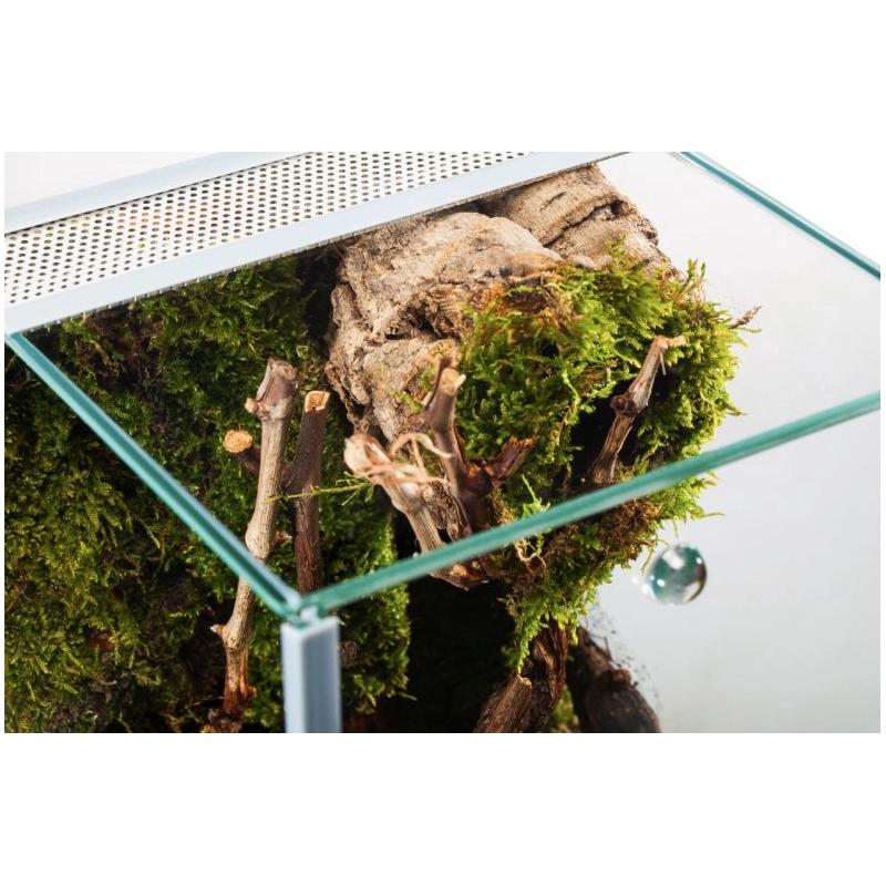 Wentylacja grawitacyjna zapewnia właściwą cyrkulację powietrza i pozwala na utrzymanie odpowiedniej wilgotności. Wlot powietrzą jest przysłonięty perforowaną blachą, co zapobiega ucieczce zwierząt i żywych pokarmów. Jednolite szklane drzwi typu “gilotyna” dają pełen komfort obserwacji. Wysuwają się do góry, dając dobry dostęp do wnętrza zbiornika. Pozwalają na szybkie i łatwe karmienie i sprzątanie. Drzwiczki można wyjąć, co znacznie ułatwia prace serwisowe w zbiorniku. Posiadają uchwyt, dzięki czemu nie musisz ich dotykać palcami, co pozostawia brzydkie ślady na szybie. Szklany sufit z wbudowaną kratką wentylacyjną zapewnia bezpieczeństwo, umożliwia swobodny przepływ powietrza. Szlifowane krawędzie szkła dają nie tylko pełne bezpieczeństwo obsługi ale również podnoszą estetykę zbiornika.
