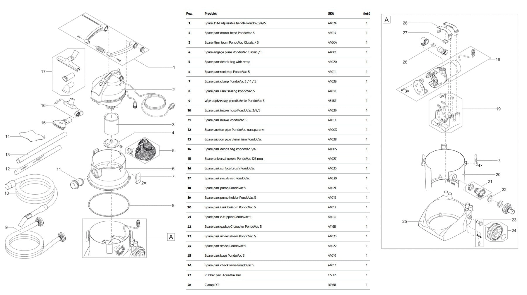 Decydując się na PondoVac 5, otrzymasz także duży asortyment akcesoriów, które usprawnią odkurzanie. Warto zwrócić uwagę na rurę ssącą, która jest przezroczysta, co umożliwia kontrolę przepływu. W zestawie znajdują się także cztery aluminiowe, solidne rury ssące, które są odporne na zginanie, dlatego podczas czyszczenia np. przy użyciu dyszy pędzlowej, można bez obaw zwiększyć nacisk. Kolejnymi akcesoriami są specjalna dysza do alg i glonów nitkowatych, poszerzona uniwersalna dysza do usuwania zanieczyszczeń dennych, dysza do większych powierzchni typu stawy i baseny, szczotka ssawna do pracy na mokro w pomieszczeniach i na zewnątrz budynków, dysza ze szczotką do narożników i trudnych, uporczywych zanieczyszczeń, worek do zbierania zanieczyszczeń, wąż ssawny o długości 5 m oraz wąż odpływowy o długości 10 m.