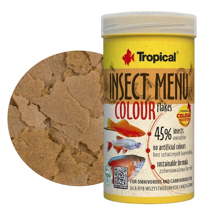 Tropical Insect Menu Colour Flakes to wybarwiajacy pokarm na bazie owadów. W jego składzie znajdziesz hermetię, jedwabnika i mącznika młynarka. Przeznaczony dla wszystkożernych i mięsożernych ryb akwariowych. Odwzorowuje naturalną dietę ryb. Ma formę płatków. Polecany dla gatunków żerujących w środkowej i dolnej strefie zbiornika.